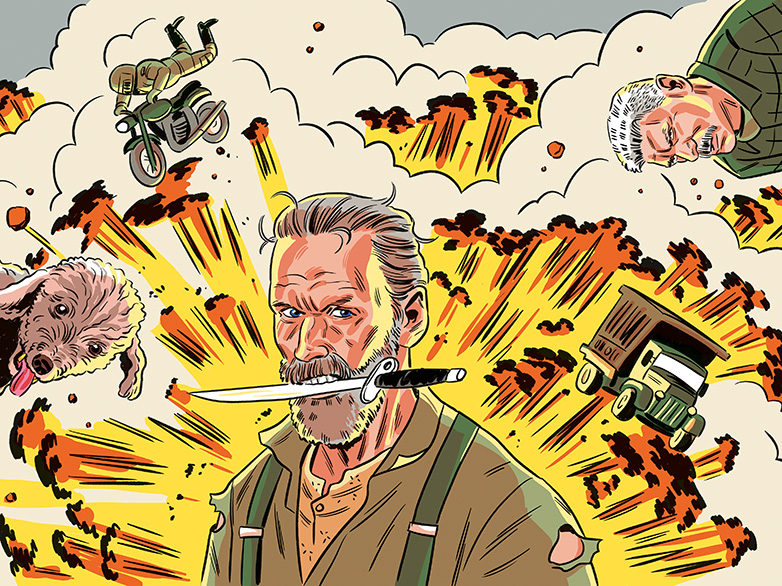 Set in 1944, during the Lapland War between Finland and Nazi Germany, Sisu is the story of a taciturn, incredibly tough, old, gold prospector, Aatami Korpi. A former commando, he discovers a rich seam of nuggets in the wilderness, but on his trek to cash them in he is intercepted by a large Waffen-SS platoon, led by Bruno Helldorf, a psychotic Obersturmführer. These reprehensibles are heavily armed and have a tank, while all Aatami has is his knife and a pick-axe. But, despite being gruesomely injured, he proceeds to slaughter them all in gory ways, having been antagonised by their unkind treatment of his fluffy white Bedlington Terrier. Only when Aatami gets to the bank does he utter his first words: “Bills, big ones please. Won’t be so damn heavy to carry.” Clint Eastwood was a chatterbox in comparison.