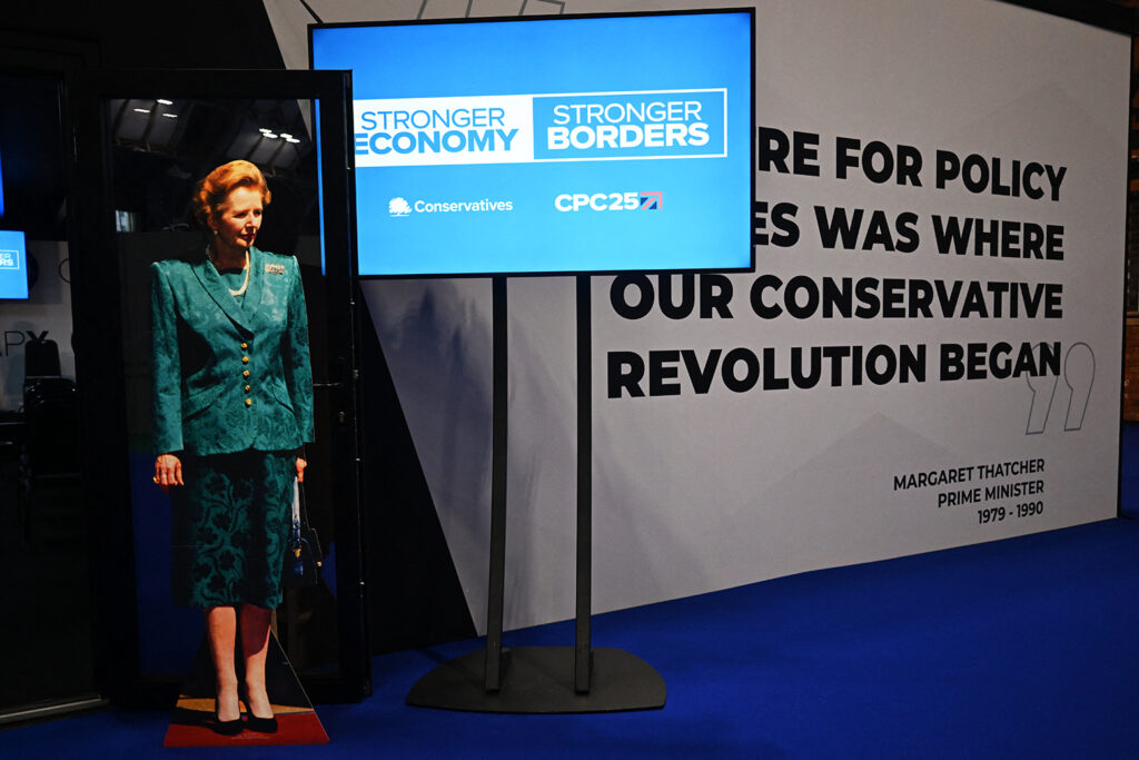 The TPA tent is decorated with a giant TV screen showing the national debt ticking up, second by second. This is the other Conservative strategy: economy, economy, economy. “Stronger Economy, Stronger Borders” screams the slogan emblazed on everything. The big announcement from shadow chancellor Mel Stride, reimagining himself as a British, wild-swimming version of chainsaw-wielding Javier Milei, is £47bn worth of public spending cuts – about the size of the black hole Liz Truss found herself with after the tax-cutting mini-Budget. The money would come from stripping back welfare from non-UK citizens and slashing the civil servant headcount. It’s not clear that the numbers add up, but apparently this isn’t the point. “We’re the only party talking about fiscal responsibility,” a slightly giddy Tory policy wonk tells me on Sunday night when the press release gets sent round. “Labour are spend spend spend, Reform are just as bad. We’re the only centre-right party left. Voters want a party that will be honest about public finances.” I point out that in the Exhibition Hall, just opposite the life-sized Margaret Thatcher cardboard cut-out welcoming guests to the Centre for Policy Studies lounge, stands a wall-sized sign demanding “Keep Winter Fuel”. It has been placed there by CCHQ, to fill the space in the absence of a corporate stall to take the slot. I ask if fiscal responsibility also applies to the over-65s. He goes to get another drink.