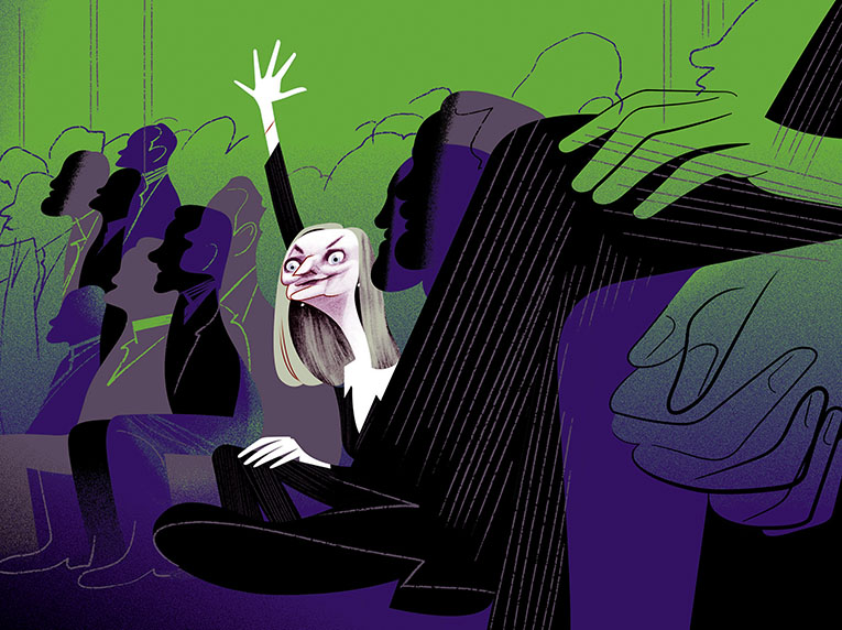 Then Truss arrives, quietly. Any other former PM would arrive two minutes before they are due on stage and expect to be whisked to a private room; they would affect to be extremely busy, right up to the point at which their valuable time could be shared with the public. Truss just walks in, at the same time as everyone else – she’s not due on stage for several hours – and wanders around making awkward small talk. She wears a pinstripe suit, a white shirt, an outfit with more than a hint of Thatcherite finance to it. When the first session is underway, after the Buckingham vice-chancellor wishes us all “freedom of thought”, she listens from the front row, and during the Q&A she raises her hand; she has to wait several minutes before she’s picked to ask her question.