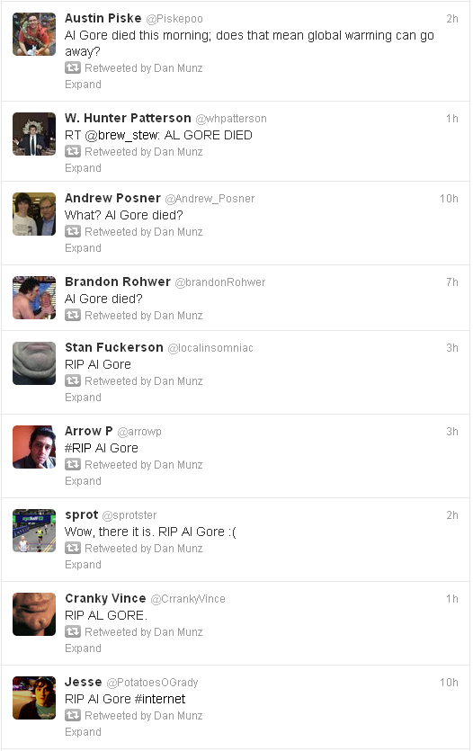Twitter user Dan Munz has done a public service, collecting all the people who think that Al Gore died this morning (it was, of course, Gore Vidal). Here’s a selection; visit his feed for more: